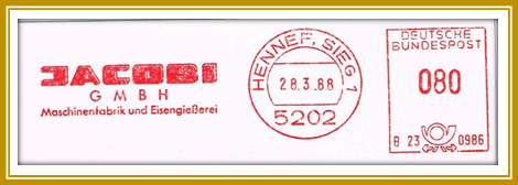 1988, 28. März. Briefstück frankiert mit Freistempel der Jacobi G.m.b.H. Maschinenfabrik und Eisengießerei portogerecht entwertet mit 80 Pf. Freistempler vom Type PA mit Posthorn unten (im Gegensatz zur Type-N Familie ist das Posthorn nun abstrakter gezeichnet). Wahrscheinlich immer noch mit der Francotyp „C“ produziert. Datum mit Trennpunkten.