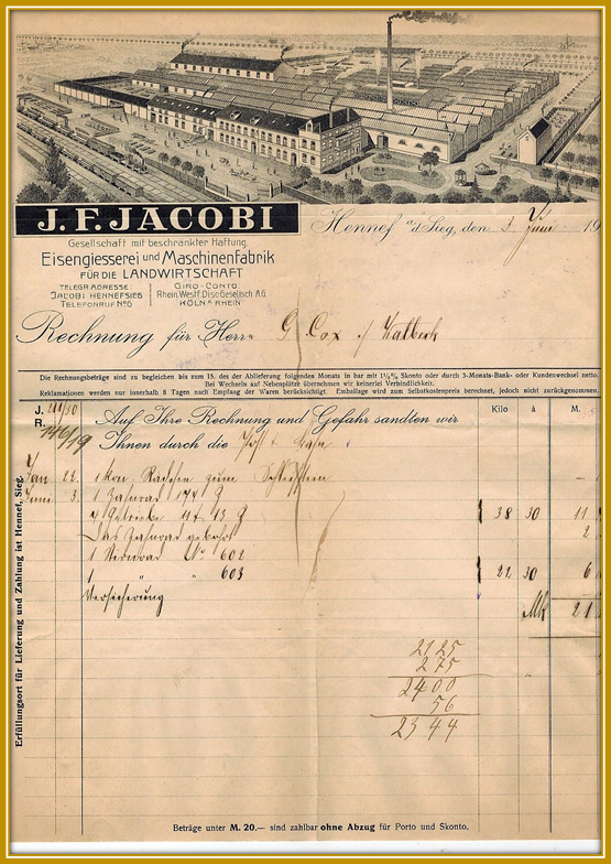 Alte Rechnung der Eisengießerei und Maschinenfabrik J.F. Jacobi