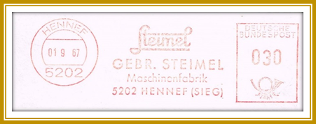 1967, 1. September. Briefstück frankiert mit Freistempel der Steimel Gebr. Steimel Maschinenfabrik portogerecht entwertet mit 30 Pf. Freistempler vom Type NA 10 mit Posthorn. Erstellt mit einer Francotyp CC / CCm“ Maschine. Das Datum wird mit Punkten separiert.