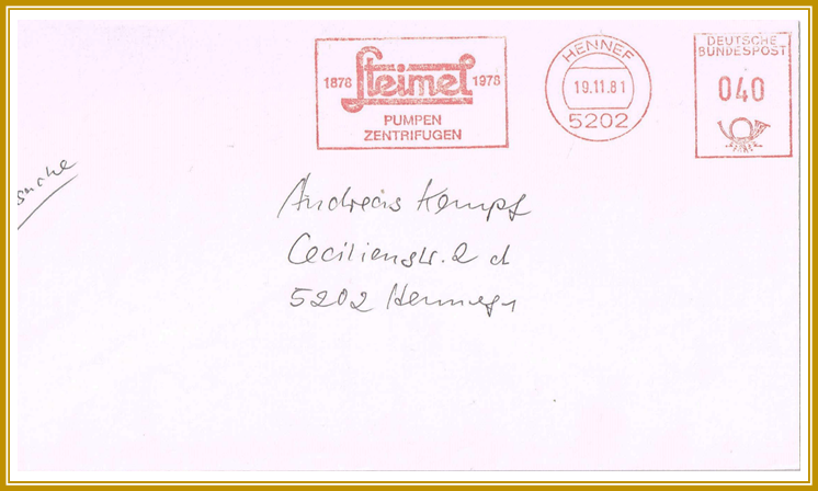 1981, 19. November. Brief frankiert mit Freistempel der Steimel Pumpen und Zentrifugen portogerecht entwertet mit 40 Pf. Freistempler vom Type NA 10 mit Posthorn. Erstellt mit einer Francotyp CC / CCm“ Maschine. Das Datum wird mit Punkten separiert.