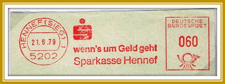 1979, 21. Juni. Briefstück frankiert mit Freistempel der Sparkasse Hennef portogerecht entwertet mit 60 Pfennig. Freistempler vom Type N mit Posthorn unten. Erstellt mit einer Francotyp Model C. Werbelogo: „wenn’s um Geld geht Sparkasse Hennef“