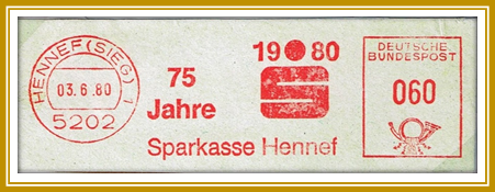 1980, 3. Juni. Briefstück frankiert mit Freistempel der Sparkasse Hennef portogerecht entwertet mit 60 Pfennig. Freistempler vom Type N mit Posthorn unten. Erstellt mit einer Francotyp Model C. Werbelogo: „75 Jahre Sparkasse Hennef“