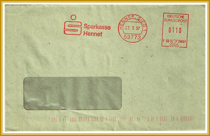1997, 23. September. Brief frankiert mit Freistempel der Sparkasse Hennef portogerecht entwertet mit 110 Pfennig. Freistempler vom Type PA 2 mit abstraktem Posthorn unten. Wahrscheinlich erstellt mit einer Postalia „D2/D3“. Werbelogo: „Sparkasse Hennef“. Dieser Freistempler ist identisch mit dem Freistempler von 1985, ist also somit seit ~12 Jahren im Gebrauch.