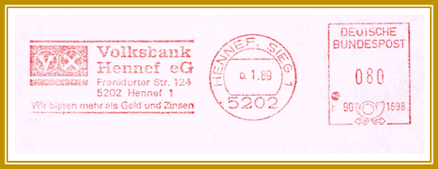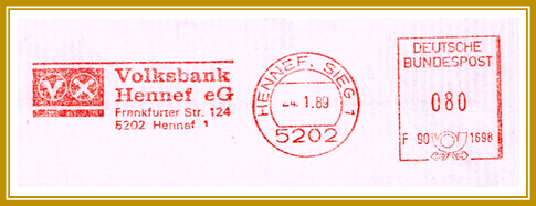 1989, 6. Januar. Briefstück frankiert mit Freistempel der Volksbank Hennef Eg portogerecht entwertet mit 80 Pfennig. Freistempler vom Type PA 4 mit abstraktem Posthorn unten. Wahrscheinlich erstellt mit einer Francotyp “A9000”. „Kaffeebohne“ über dem „F“ unten rechts. Werbelogo: „Wir bieten mehr als Geld und Zinsen“