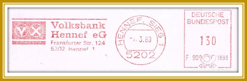 1989, 7. März. Briefstück frankiert mit Freistempel der Volksbank Hennef Eg portogerecht entwertet mit 130 Pfennig. Freistempler vom Type PA 4 mit abstraktem Posthorn unten. Wahrscheinlich erstellt mit einer Francotyp “A9000”. Werbelogo: Ohne Werbespruch