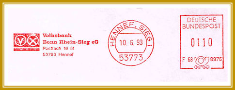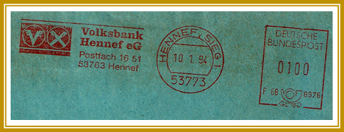 1994, 10. Januar. Briefstück frankiert mit Freistempel der Volksbank Hennef Eg portogerecht entwertet mit 100 Pfennig. Freistempler vom Type PA 5 mit abstraktem Posthorn unten. Wahrscheinlich erstellt mit einer Francotyp-Postalia “EFS3000/NEF300”
