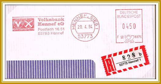 1994, 20. April. Einschreiben-Briefstück frankiert mit Freistempel der Volksbank Hennef Eg portogerecht entwertet mit 450 Pfennig. Freistempler vom Type PA 5 mit abstraktem Posthorn unten. Wahrscheinlich erstellt mit einer Francotyp-Postalia “EFS3000/NEF300”