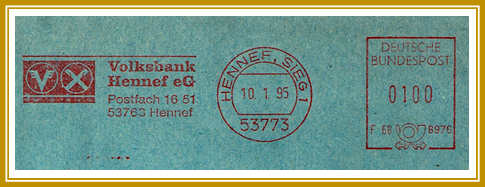 1995, 10. Januar. Einschreiben-Briefstück frankiert mit Freistempel der Volksbank Hennef Eg portogerecht entwertet mit 100 Pfennig. Freistempler vom Type PA 5 mit abstraktem Posthorn unten. Wahrscheinlich erstellt mit einer Francotyp-Postalia “EFS3000/NEF300”