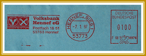 1997, 7. Januar. Einschreiben-Briefstück frankiert mit Freistempel der Volksbank Hennef Eg portogerecht entwertet mit 100 Pfennig. Freistempler vom Type PA 5 mit abstraktem Posthorn unten. Wahrscheinlich erstellt mit einer Francotyp-Postalia “EFS3000/NEF300”
