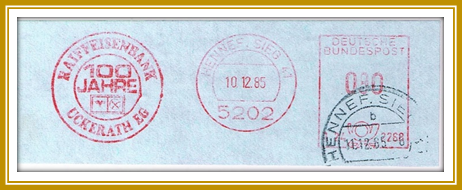 1985, 10. Dezember. Briefstück frankiert mit Freistempel der Raiffeisenbank Uckerath EG portogerecht entwertet mit 80 Pfennig. Freistempler vom Type PA 1 mit abstraktem Posthorn unten. Wahrscheinlich erstellt mit einer Francotyp “Cc/Ccm”