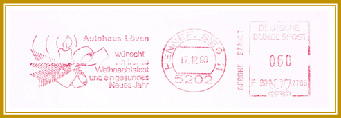 1984, 19. Dezember. Briefstück frankiert mit Freistempel von Autohaus Löven aus Uckerath. portogerecht entwertet mit 70 Pfennig. Der Datumsstempel zeigt Hennef Sieg 41, die Filialnummer von Uckerath. Freistempler vom Type PA 4 mit abstraktem Posthorn unten. Wahrscheinlich erstellt mit einer Francotyp “A9000”.