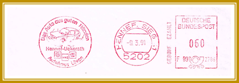 1991, 9. März. Briefstück frankiert mit Freistempel von Autohaus Löven aus Uckerath. portogerecht entwertet mit 60 Pfennig. Der Datumsstempel zeigt Hennef Sieg 41, die Filialnummer von Uckerath. Freistempler vom Type PA 4 mit abstraktem Posthorn unten. Wahrscheinlich erstellt mit einer Francotyp “A9000”.