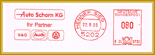 1986, 22. August. Briefstück frankiert mit Freistempel von Autohaus Schorn aus Hennef portogerecht entwertet mit 80 Pfennig. Freistempler vom Type PA 1 mit abstraktem Posthorn unten. Wahrscheinlich erstellt mit einer Francotyp “Cc/Ccm”. Klischee-Feld mit Motto: „Auto Schorn KG / Ihr Partner“ und Logos von V.A.G., Audi und VW.