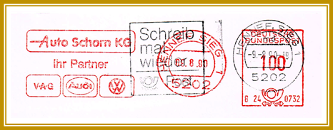 1990, 9. August. Briefstück frankiert mit Freistempel von Autohaus Schorn aus Hennef portogerecht entwertet mit 100 Pfennig. Zusätzlich ausnahmsweise gestempelt durch das Postamt Hennef mit Werbestempel „Schreib mal wieder“. Freistempler vom Type PA 1 mit abstraktem Posthorn unten. Wahrscheinlich erstellt mit einer Francotyp “Cc/Ccm”. Klischee-Feld mit Motto: „Auto Schorn KG / Ihr Partner“ und Logos von V.A.G., Audi und VW.