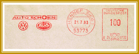 1993, 9. August. Briefstück frankiert mit Freistempel von Autohaus Schorn aus Hennef portogerecht entwertet mit 100 Pfennig. Freistempler vom Type PA 1 mit abstraktem Posthorn unten. Wahrscheinlich erstellt mit einer Francotyp “Cc/Ccm”. Klischee-Feld mit Motto: „Auto Schorn KG“ und Logos von VW und Audi. Datumsstempel jetzt mit 5-stelliger Postleitzahl.