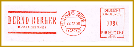 1989, 22. Dezember. Briefstück frankiert mit Freistempel des Damenmodegeschäftes Bernd Berger aus Hennef portogerecht entwertet mit 080 Pfennig. Freistempler vom Type PA 5 mit Posthorn unten. Wahrscheinlich erstellt mit einer Francotyp-Postalia “EFS3000/NEF300”. Klischee-Feld mit Motto: „BERND BERGER / D-5202 HENNEF“.