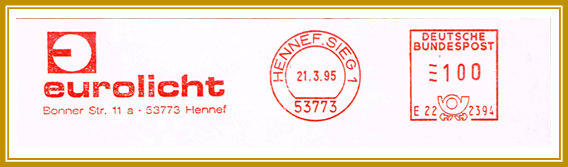1995, 21. März. Briefstück frankiert mit Freistempel des Lampengeschäfts Eurolicht aus Hennef portogerecht entwertet mit 100 Pfennig. Freistempler vom Type PA 7 mit Posthorn unten. Wahrscheinlich erstellt mit einer Pitney Bowes “6300 series“. Klischee-Feld mit Motto: „eurolicht / Bonner Str. 11 a . 53773 Hennef“.