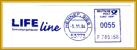 2004, 3. November. Briefstück frankiert mit Freistempel des Einrichtungshauses LIFE line aus Hennef portogerecht entwertet mit 55 Cent. Freistempler vom Type RB 6 mit Posthorn oben. Wahrscheinlich erstellt mit einer Francotyp-Postalia “T1000”. Klischee-Feld mit Motto: „Life line / Einrichtungshäuser“.