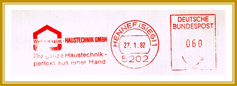 1982, 27. Januar. Briefstück frankiert mit Freistempel der Firma Wollersheim Haustechnik GmbH aus Hennef portogerecht entwertet mit 60 Pfennig. Freistempler vom Type NA 13 mit Posthorn unten. Erstellt mit einer Postalia “D2/D3”. Klischee-Feld mit Motto: „Wollersheim HAUSTECHNIK GMBH / Die ganze Haustechnik / perfekt aus einer Hand“.