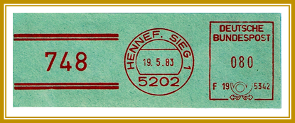 1983, 19. Mai. Briefstück frankiert mit Freistempel aus Hennef portogerecht entwertet mit 80 Pfennig. Freistempler vom Type PA 2 mit Posthorn unten. Erstellt mit einer Postalia “D2/D3”. Klischee-Feld mit Motto: „748“ umrahmt mit zwei Doppelbalken.