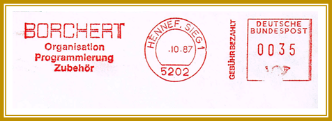 1987, 19. Mai. Briefstück frankiert mit Freistempel der EDV Firma Bochert aus Hennef portogerecht entwertet mit 35 Pfennig. Freistempler vom Type NA 22 mit Posthorn unten. Erstellt mit einer Neopost “Frankmaster 505”. Klischee-Feld mit Motto: „BORCHERT / Oeganisation / Programmierung / Zubehör“.