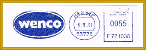 2004, 8. September. Briefstück frankiert mit Freistempel der Firma Wenco aus Hennef portogerecht entwertet mit 55 Cent. Freistempler vom Type RB 6 mit Posthorn oben. Erstellt mit einer Francotyp-Postalia “T1000”. Klischee-Feld mit Motto: „wenco“ in blauem Oval.
