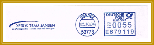2004, 5. Oktober. Briefstück frankiert mit Freistempel der Firma XEROX TEAM JANSEN aus Hennef portogerecht entwertet mit 55 Cent. Freistempler vom Type RB 20 mit Posthorn oben. Erstellt mit einer Pitney Bowes “Personal Post”. Klischee-Feld mit Motto: „XEROX TEAM JANSEN / Vertragspartner für innovative Lösungen“.