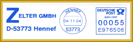 2004, 4. November. Briefstück frankiert mit Freistempel der Firma Zelter GmbH aus Hennef portogerecht entwertet mit 55 Cent. Freistempler vom Type RB 19 mit Posthorn oben. Erstellt mit einer Pitney Bowes “EasyMail”. Klischee-Feld mit Motto: „ZELTER GMBH / D-53773 Hennef“.