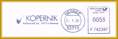 2005, 31. Januar. Briefstück frankiert mit Freistempel der Firma Kopernik aus Hennef portogerecht entwertet mit 55 Cent. Freistempler vom Type RB 6 mit Posthorn oben. Erstellt mit einer Francotyp-Postalia “T1000”. Klischee-Feld mit Motto: „KOPERNIK / Büllesfeld 2a s 53773 Hennef“
