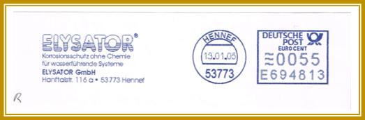 2005, 13. Januar. Briefstück frankiert mit Freistempel der Firma ELYSATOR aus Hennef portogerecht entwertet mit 55 Cent. Freistempler vom Type RB 20 mit Posthorn oben. Erstellt mit einer Pitney Bowes “Personal Post”. Klischee-Feld mit Motto: „ELYSATOR / Korrosionsschutz ohne Chemie / Elysator GmbH / Hanftalstr. 116 a s 53773 Hennef“.