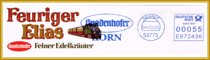 2005, 4. Februar. Briefstück frankiert mit Freistempel der Firma Quadenhofer Korn aus Hennef portogerecht entwertet mit 55 Cent. Freistempler vom Type RB 19 mit Posthorn oben. Erstellt mit einer Pitney Bowes “EasyMail”. Klischee-Feld mit Motto: „Quadenhofer Korn“.