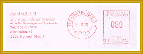 1988, 25. November. Briefabschnitt einer Arztpraxis für Neurologie aus Hennef mit Maschinen-Freıstempler. Wert: 80 Pfennig. Der Freistempel ist vom Type NA 13 und wurde mit einer Maschine Postalia “D2/D3” erstellt. Logo: „Manfred Hild / Dr. med. Klaus Krüger