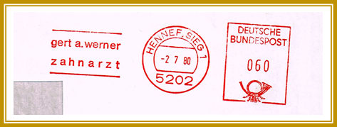 1980, 2. Juli. Briefabschnitt der Zahnarztpraxis Gert Werner aus Hennef mit Maschinen-Freıstempler. Wert: 60 Pfennig. Der Freistempel ist vom Type NA 13 und wurde mit einer Maschine Postalia “D2/D3” erstellt. Logo: „“gert a. werner / zahnarzt“.