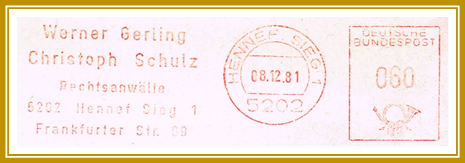 1981, 8. Dezember. Briefabschnitt der Rechtsanwaltskanzlei Gerling Schulz aus Hennef mit Maschinen-Freıstempler. Wert: 60 Pfennig. Der Freistempel ist vom Type NA 13 und wurde mit einer Maschine Postalia “D2/D3” erstellt. Logo: „Werner Gerling / Christoph Schulz / Rechtsanwälte / 5202 Hennef Sieg 1 / Frankfurter Str. 69“.