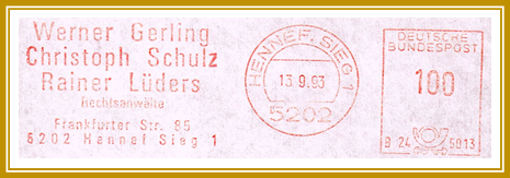 1993, 9. April. Briefabschnitt der Rechtsanwaltskanzlei Gerling Schulz Lüders aus Hennef mit Maschinen-Freıstempler. Wert: 100 Pfennig. Der Freistempel ist vom Type PA 2 und wurde mit einer Maschine Postalia “D2/D3” erstellt. Logo: „Werner Gerling / Christoph Schulz / Rainer Lüders / Rechtsanwälte Frankfurter Str. 85 / 5202 Hennef Sieg 1“.