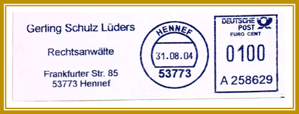 2004, 31. August. Briefabschnitt der Rechtsanwaltskanzlei Gerling Schulz Lüders aus Hennef mit Maschinen-Freıstempler. Wert: 100 Pfennig. Der Freistempel ist vom Type RB 11 und wurde mit einer Maschine Frama “Sensonic” erstellt. Logo: „Gerling Schulz Lüders / Rechtsanwälte Frankfurter Str. 85 / 53773 Hennef Sieg“.