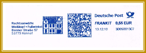 2010, 13. Dezember. Briefabschnitt der Rechtsanwaltskanzlei Weißkopf und Fußwinkel aus Hennef mit Frankit-Freıstempler. Wert: 55 Cent. Die Frankatur ist vom Type S 3 und wurde mit einer Maschine der Firma Francotyp-Postalia erstellt. Logo: „Rechtsanwälte / Weißkopf + Fußwinkel / Bonner Straße 57 / 53773 Hennef“ plus skizziertes Bild des Gebäudes.
