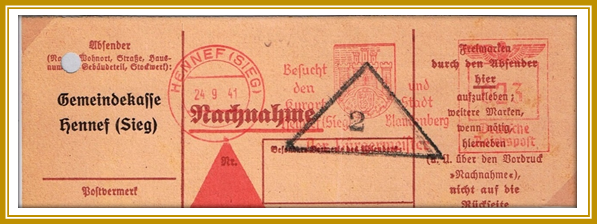 1941, 24. September. Ausschnitt einer Nachnahmekarte der Gemeindekasse Hennef mit Maschinen-Freıstempler der Gemeindeverwaltung Hennef. Wert: 23 Pfennig. Der Freistempel ist vom Type F 3 und wurde mit einer Maschine Francotyp C erstellt. Logo: „Besucht den Kurort Hennef (Sieg) und Stadt Blankenberg. Der Bürgermeister.“