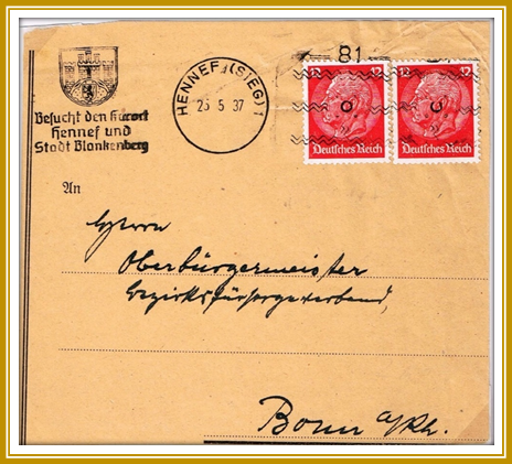 1937: 23. Mai, Brief von Hennef nach Bonn, Maschinen-Werbestempel mit Wappen und Werbetext. Beleg für den Einsatz eines ähnlichen Werbe-Stempels zum Freistempel von den vorherigen Seiten.