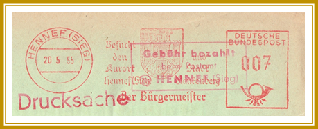 1955, 20. Mai. Briefabschnitt mit Maschinen-Freıstempler der Gemeindeverwaltung Hennef. Wert: 7 Pfennig portogerecht für eine Drucksache. Der Freistempel ist vom Type NA 3 und wurde mit einer Maschine Francotyp C erstellt. Als Besonderheit: Zusätzlicher Stempel: Gebühr bezahlt beim Postamt Hennef (Sieg).