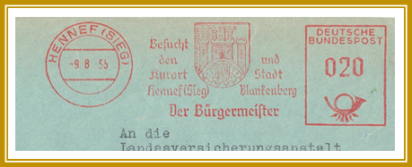 1955, 9. August. Briefabschnitt mit Maschinen-Freıstempler der Gemeindeverwaltung Hennef. Wert: 20 Pfennig portogerecht für einen Brief. Der Freistempel ist vom Type NA 3 und wurde mit einer Maschine Francotyp C erstellt.