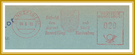 1960, 9. Mai. Briefabschnitt mit Maschinen-Freıstempler der Gemeindeverwaltung Hennef. Wert: 20 Pfennig. Der Freistempel ist vom Type NA 3 und wurde mit einer Maschine Francotyp C erstellt. Damals war ein Briefporto noch jahrelang unverändert, nämlich von 1948 – 1966. Hier wurde das Layout des Logofeldes erstmals verändert: „Der Bürgermeister“ wurde weggelassen.