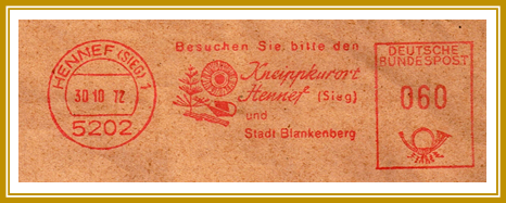 1972, 30. Oktober. Briefabschnitt mit Maschinen-Freıstempler der Gemeindeverwaltung Hennef. Wert: 60 Pfennig. Der Freistempel ist vom Type NA 3 und wurde mit einer Maschine Francotyp C erstellt. Es ist zu beachten, dass hier erstmals das Layout grundlegend geändert wurde. Anstatt des Hennefer Wappens wird hier nun der „“Kneippkurort“ illustriert und beworben. Weiterhin taucht erstmals die Postleitzahl „5202“ im Datumsstempel auf.
