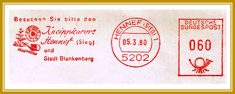 1980, 5. März. Briefabschnitt mit Maschinen-Freıstempler der Gemeindeverwaltung Hennef. Wert: 60 Pfennig. Der Freistempel ist vom Type NA 11 und wurde mit einer Maschine Francotyp “A9000” erstellt. Das Datum hat jetzt Trennpunkte und Logo und Slogan ist links vom Datumsstempel. Zwischen 1973 und 1980 wurde also die Freistempelmaschine ersetzt.