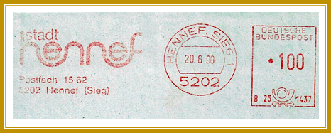 1990, 20. Juni. Briefabschnitt mit Maschinen-Freıstempler der Gemeindeverwaltung Hennef. Wert: 100 Pfennig. Der Freistempel ist vom Type PA 1 und wurde mit einer Maschine Francotyp “Cc/Ccm” erstellt. Das Posthorn unten im Wertstempel ist jetzt abstrakt. Früher Gebrauch des Stempels. Das Klischee ist unverändert: stadt hennef Postfach 15 62 5202 Hennef (Sieg)“.