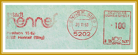 1993, 26. Juni. Briefabschnitt mit Maschinen-Freıstempler der Gemeindeverwaltung Hennef. Wert: 100 Pfennig. Der Freistempel ist vom Type PA 1 und wurde mit einer Maschine Francotyp “Cc/Ccm” erstellt. Das Posthorn unten im Wertstempel ist abstrakt. Später Gebrauch des Stempels, da kurz danach die Postleitzahl 5-stellig wurde und der Datumstempel geändert werden musste. Das Klischee ist unverändert: stadt hennef Postfach 1562 5202 Hennef (Sieg)“.
