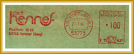 1994, 21. Januar. Briefabschnitt mit Maschinen-Freıstempler der Gemeindeverwaltung Hennef. Wert: 100 Pfennig. Der Freistempel ist vom Type PA 1 und wurde mit einer Maschine Francotyp “Cc/Ccm” erstellt. Das Posthorn unten im Wertstempel ist abstrakt. Früher Gebrauch des Stempels, da kurz vorher die Postleitzahl 5-stellig wurde und der Datumstempel geändert wurde. Das Klischee ist unverändert: stadt hennef Postfach 15 62 53762 Hennef (Sieg)“.