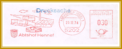 1974, 20. Dezember. Briefabschnitt mit Maschinen-Freıstempler des Abtshof Hennef portogerecht entwertet mit 030 Pfennig. Der Freistempel ist vom Type NA 12 und wurde mit einer Maschine Francotyp “Cc/Ccm/Cm” erstellt. Das Klischee lautet: „Abtshof Hennef“ unterhalb des Logos „Industriebetrieb.