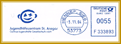 2004, 3. November. Briefabschnitt mit Maschinen-Freıstempler des Jugendhilfezentrums St. Ansgar in Hennef portogerecht entwertet mit 055 Cent. Der Freistempel ist vom Type RB 6 und wurde mit einer Maschine Francotyp-Postalia “T1000” erstellt. Das Klischee lautet: „Jugendhilfezentrum St. Ansgar / Caritas – Jugendhilfe – Gesellschaft mbH“ unterhalb des Logos „stilisierter Kinderkopf“.
