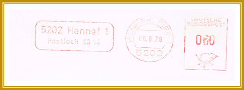 1979, 6. Juni. Briefabschnitt mit Maschinen-Freıstempler eines unbekannten Betriebes in Hennef portogerecht entwertet mit 060 Pfennig. Der Freistempel ist vom Type NA 13 und wurde mit einer Maschine Postalia “D2/D3” erstellt. Das Klischee lautet: „5202 Hennef 1 / Postfach 13 14“.